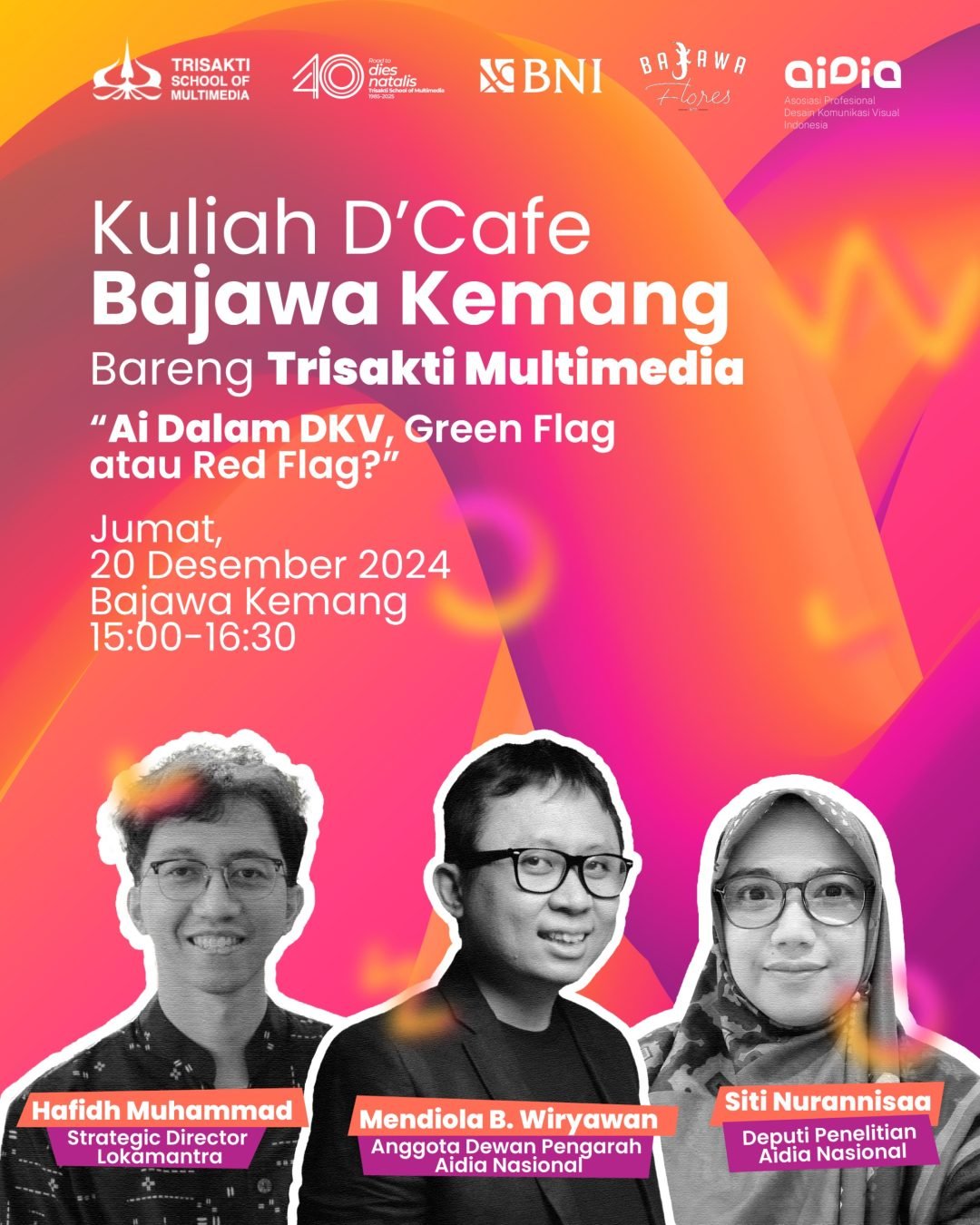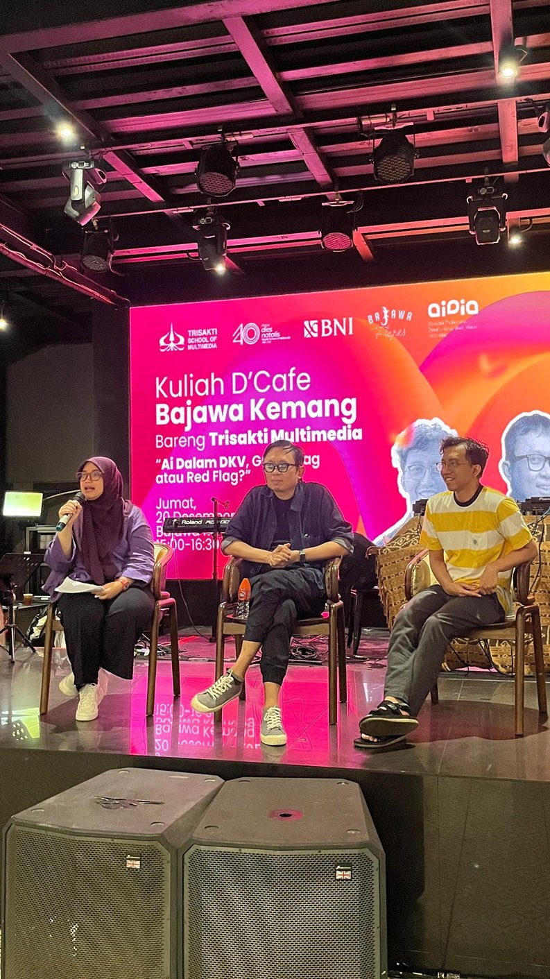 Setelah eksplorasi seru di dua episode sebelumnya, Kuliah di Café Bajawa Kemang kembali hadir dengan diskusi yang tak kalah menarik dan super trending! Pada episode kali ini, kita akan membahas “AI dalam DKV (Desain Komunikasi Visual), Green Flag atau Red Flag?”. Acara yang digagas oleh Trisakti Multimedia ini akan mengupas peran kecerdasan buatan di dunia kreatif dengan pandangan langsung dari para pakar. Acara ini dilaksanakan pada hari Jumat, 20 Desember 2024 di Bajawa Kemang, Acara ini gratis dan terbuka untuk umum. Tidak perlu registrasi, cukup datang tepat waktu dan siapkan dirimu untuk diskusi menarik!