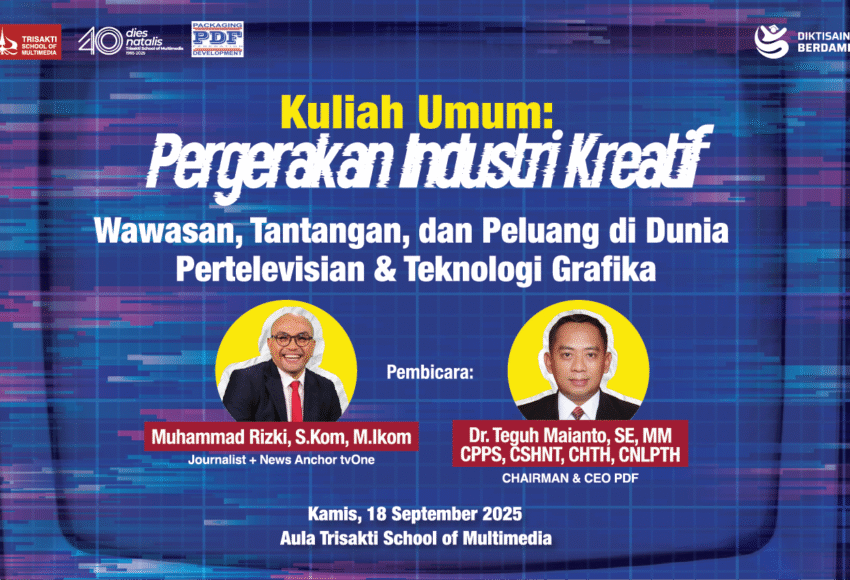 Jakarta — Kamis, 18 September 2025, menjadi hari yang penting bagi mahasiswa Desain Komunikasi Visual (DKV) dan Teknologi Grafika di Trisakti School of Multimedia. Bertempat di Aula Lantai 3, Trisakti Multimedia menggelar Kuliah Umum dengan tema “Pergerakan Industri Kreatif: Wawasan, Tantangan, dan Peluang di Dunia Pertelevisian & Teknologi Grafika”. Acara […]